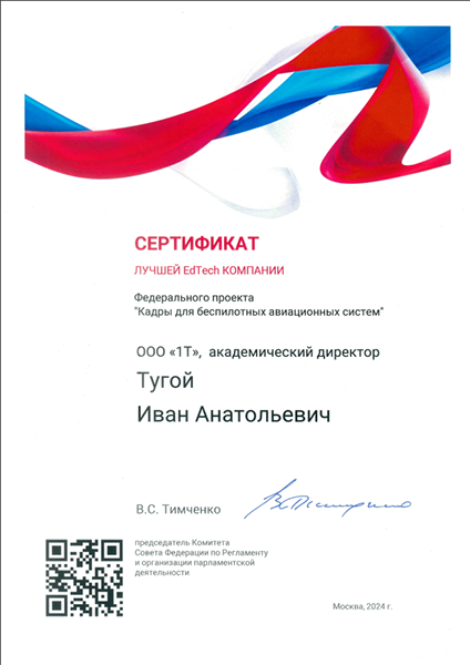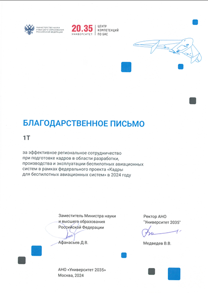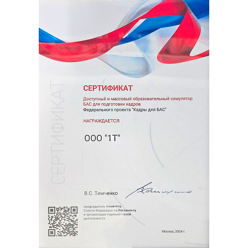 Сертификат за доступный и массовый симулятор БАС для подготовки кадров